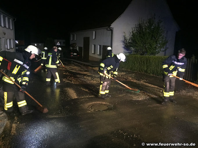 Mit Besen und Schaufeln wurde die Fahrbahn gereinigt.